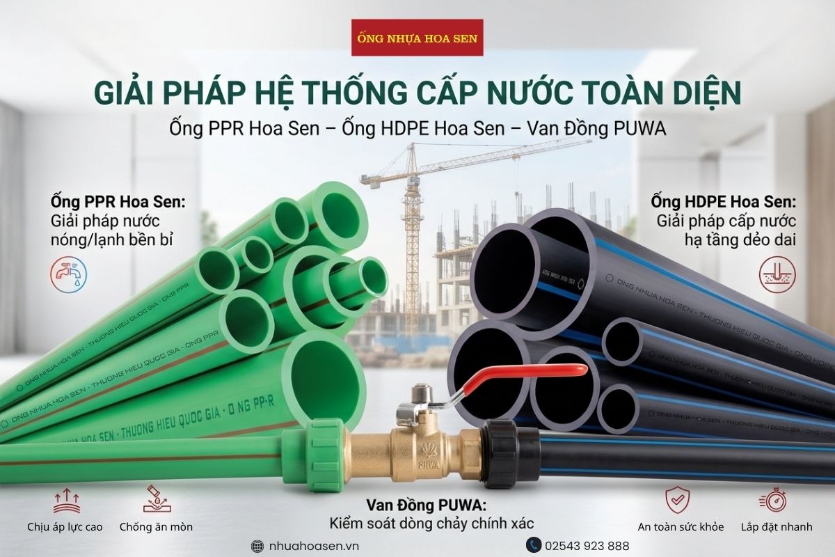 Trong đó, bộ ba Ống PPR Hoa Sen – Ống HDPE Hoa Sen – Van đồng PUWA đang trở thành lựa chọn được nhiều nhà thầu và chủ đầu tư tin dùng nhờ khả năng đáp ứng đầy đủ nhu cầu từ dân dụng đến hạ tầng.
