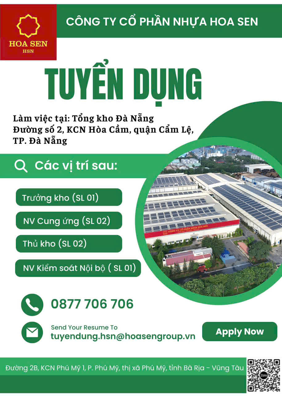 Công Ty CP Nhựa Hoa Sen tuyển dụng các vị trí Trưởng kho\ Nhân viên cung ứng\ Thủ kho\ Nhân viên kiểm soát nội bộ